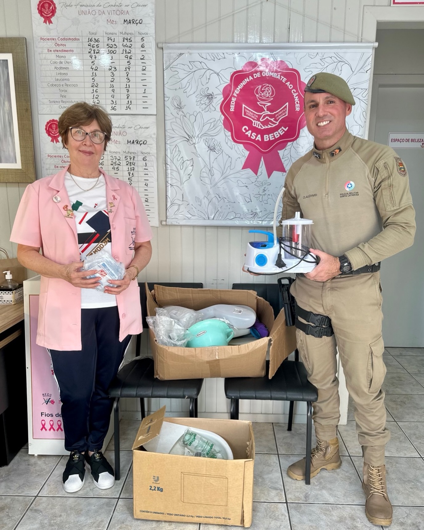 O Setor de Apoio Humanitário da Polícia Militar de Santa Catarina realizou a entrega de materiais ortopédicos para a Casa Bebel, da Rede Feminina de Combate ao Câncer, no município de União da Vitória, no Paraná. A iniciativa reforça o compromisso das instituições com o cuidado e o suporte a pessoas que enfrentam o tratamento da doença, contribuindo diretamente para a qualidade de vida dos pacientes atendidos.