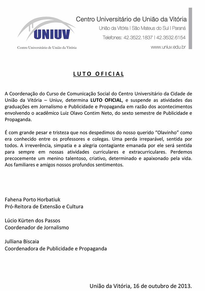 No final da manhã o Centro Universitário de União da Vitória (Uniuv), e o curso de Comunicação Social divulgou nota oficial.