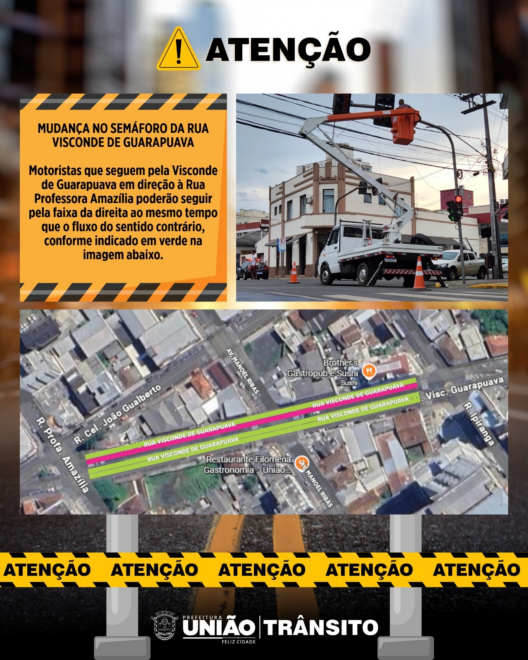 A UVTRAN anunciou uma alteração no funcionamento do semáforo localizado no cruzamento da Avenida Manoel Ribas com a Rua Visconde de Guarapuava, em União da Vitória.