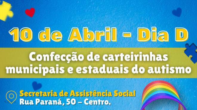 A Secretaria Municipal de Assistência Social realizará nesta quinta-feira, 10 de abri, o Dia D do Autismo, com atendimento especial, das 7h às 18h, para a solicitação e confecção da Carteira de Identificação da Pessoa com Transtorno do Espectro Autista (CIPTEA), municipal e estadual.