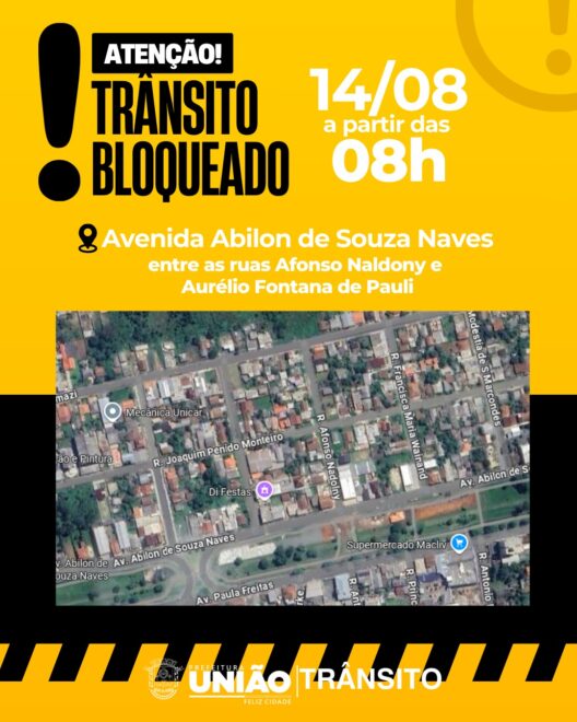 O bloqueio ocorrerá na Avenida Abilon na altura da rua Rua Afonso Naldony. Como rota alternativa, os motoristas poderão acessar a Rua Afonso Naldony e retornar à Avenida pela Rua Aurélio Fontana de Pauli.
