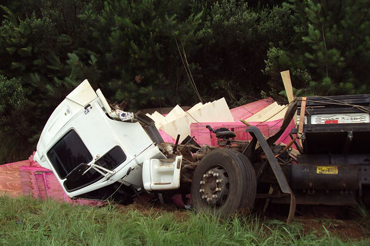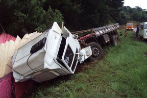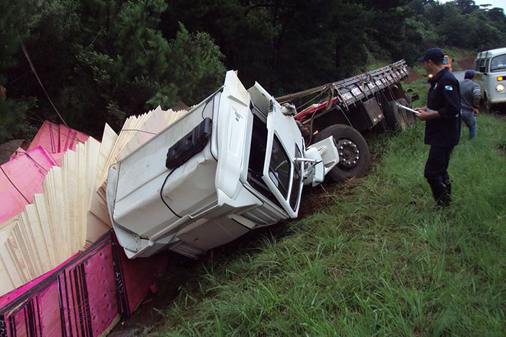 Chegando ao local, a equipe se depararam com um caminhão fora da pista e com a carga de compensado esparramada sobre a vegetação as margens da rodovia.
