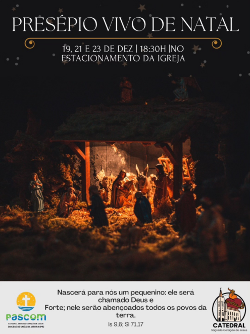A Catedral Sagrado Coração de Jesus convida a comunidade para prestigiar o Presépio Vivo de Natal, que será apresentado nos dias 19, 21 e 23 de dezembro, sempre às 18h30, no estacionamento da igreja. O evento especial, promovido pela Pascom, busca celebrar o verdadeiro significado do Natal por meio de uma encenação que retrata o nascimento de Jesus, inspirada nas palavras bíblicas de Isaías e dos Salmos: “Nascerá para nós um pequenino; ele será chamado Deus e Forte; nele serão abençoados todos os povos da terra”. A entrada é gratuita e todos estão convidados a participar desse momento de fé e emoção.