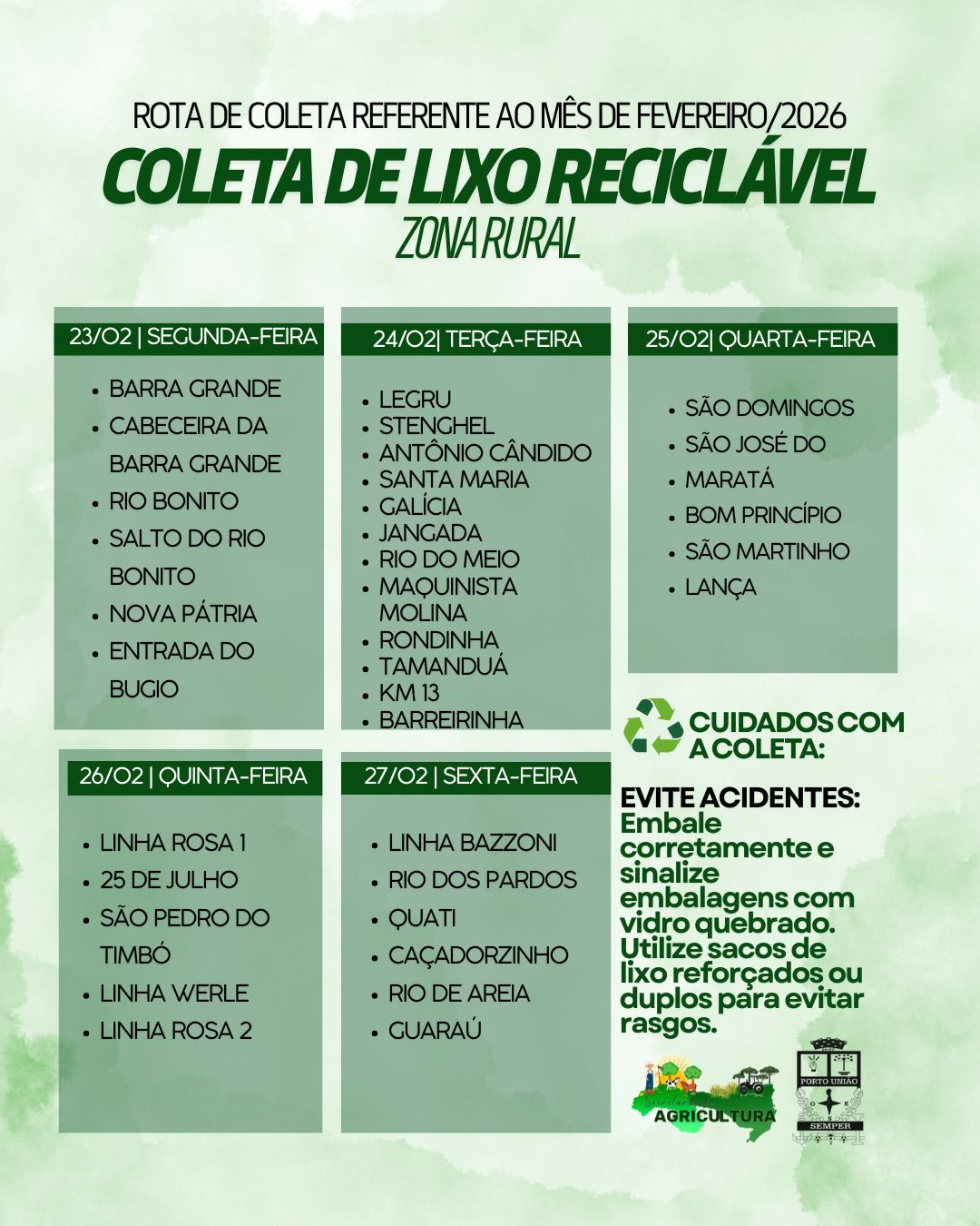 A Prefeitura de Porto União divulgou o cronograma da coleta de lixo reciclável na zona rural, que será realizada entre os dias 23 e 27 de fevereiro.