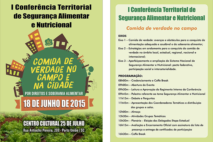 O Conselho de Segurança Alimentar e Nutricional (COMSEA) de Porto União promove nesta quinta-feira, 18, a I Conferência Territorial de Segurança Alimentar e Nutricional. O encontro acontece no Clube 25 de julho, a partir das 8h, com o credenciamento. O tema abordado durante o dia será Comida de Verdade no Campo e na Cidade.