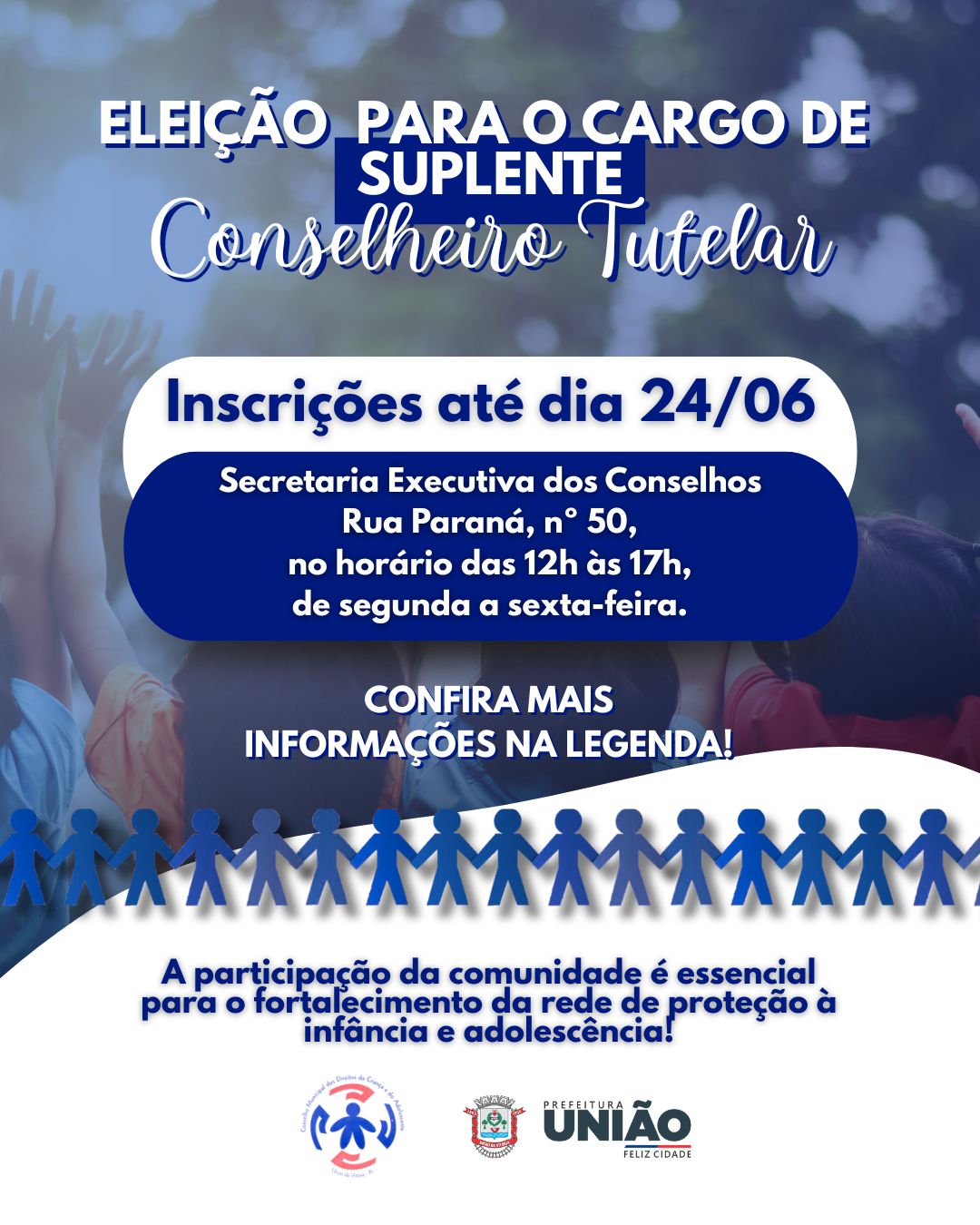 O Conselho Municipal dos Direitos da Criança e do Adolescente – CMDCA de União da Vitória informa à comunidade que está aberto o processo de inscrição para a eleição de suplência do Conselho Tutelar do Município de União da Vitória.