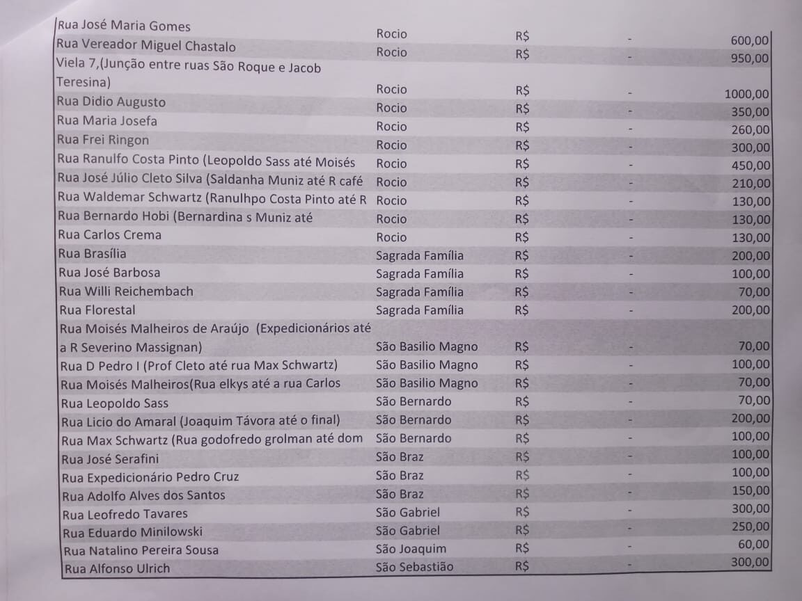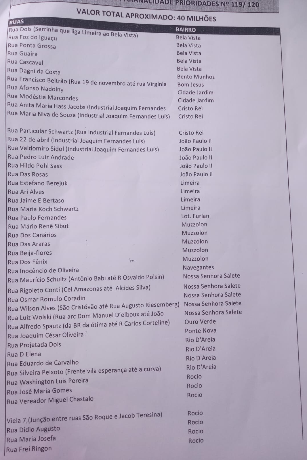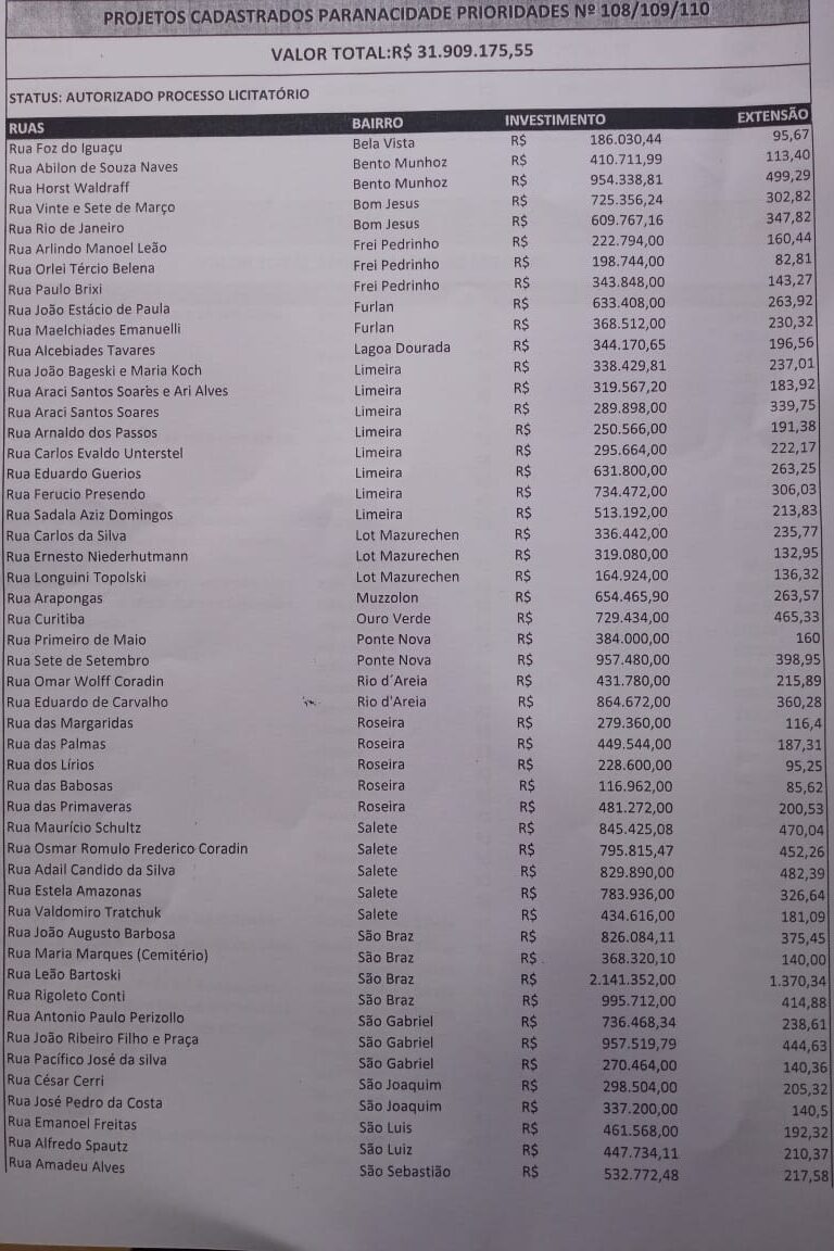 O programa de pavimentação foi o principal destaque. O primeiro lote, de R$ 31,9 milhões, já tem licitação autorizada e contempla ruas nos bairros Bela Vista, Bento Munhoz, Bom Jesus, Frei Pedrinho, Furlan, Lagoa Dourada, Limeira, Lot Mazurechen, Muzzolon, Ouro Verde, Ponte Nova, Rio d’Areia, Roseira, Salete, São Braz, São Gabriel, São Joaquim, São Luiz e São Sebastião.