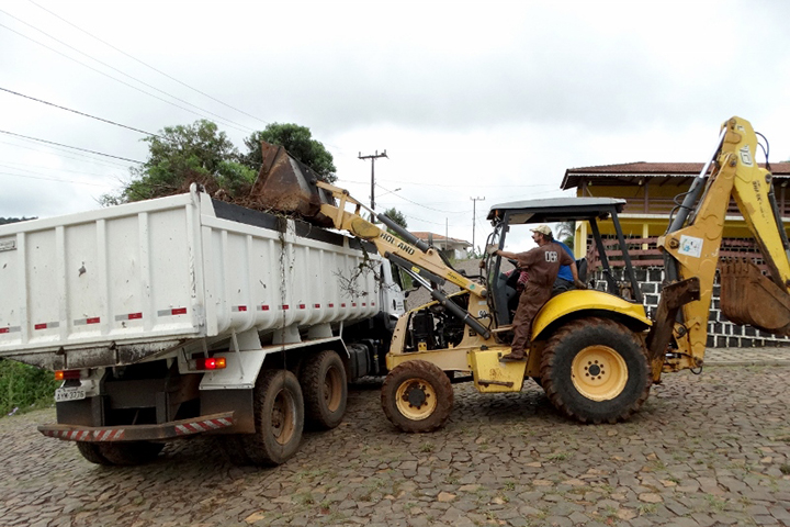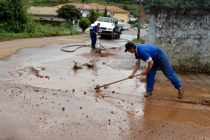 Uma das equipes realizou a limpeza das ruas que foram atingidas pelas enxurradas. A primeira ação do trabalho é o recolhimento dos entulhos que a correnteza deixou na cidade e em seguida os funcionários estão realizando a lavagem das vias públicas que tiveram grande acúmulo de lama.