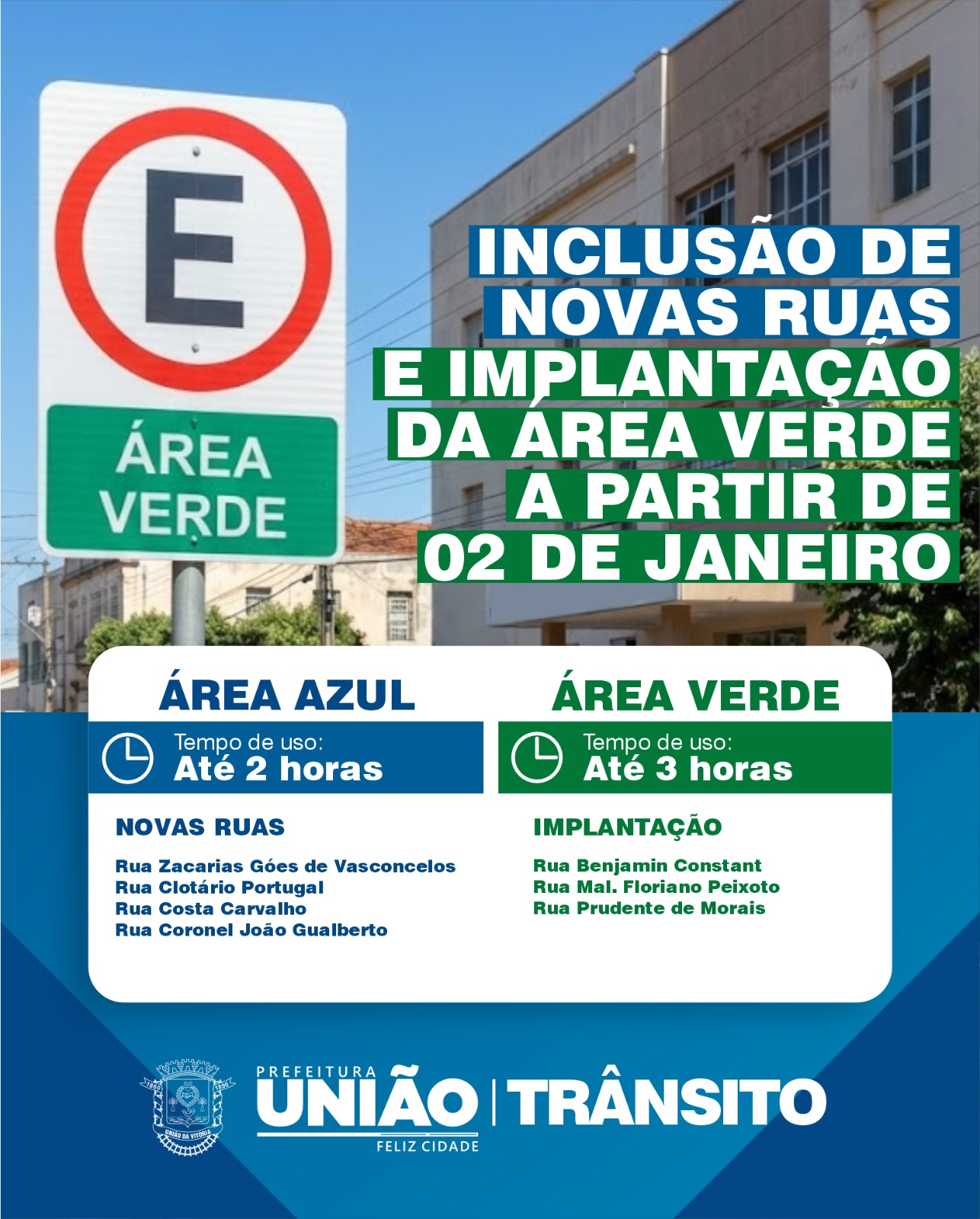 A Secretaria Municipal de Trânsito de União da Vitória – UVTRAN, informa a ampliação do Estacionamento Rotativo no município, com a inclusão de novas vias que passam a contar com vagas de estacionamento regulamentadas e também com a implantação da área verde, a partir do dia 02 de janeiro de 2026.