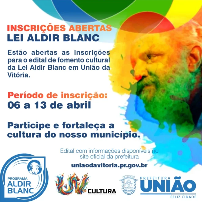 A Prefeitura de União da Vitória informa que estão abertas, entre os dias 6 e 13 de abril, as inscrições para o edital de fomento cultural com recursos da Lei Aldir Blanc. A iniciativa tem como objetivo apoiar artistas, produtores e demais agentes culturais do município, incentivando a produção, a difusão e a valorização das manifestações culturais locais.