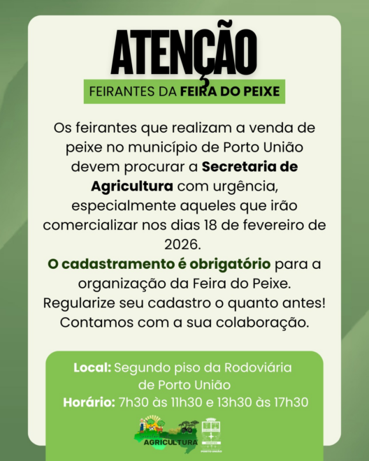 A Prefeitura de Porto União orienta os feirantes que comercializam peixe no município a regularizarem o cadastro junto à Secretaria de Agricultura para participação na tradicional Feira do Peixe. O procedimento é obrigatório para todos que desejam atuar no evento, especialmente na edição marcada para o dia 18 de fevereiro de 2026.