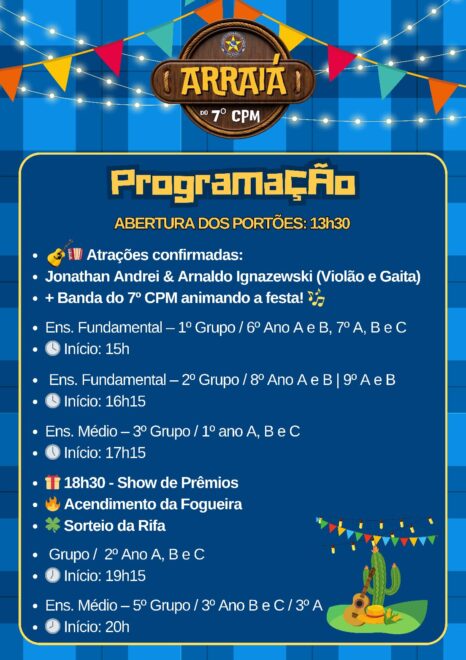 acontece Hoje O tradicional Arraiá do 7º Colégio da Polícia Militar (CPM), e promete ser uma das festas julinas mais animadas da região. Com início às 13h30, o evento contará com uma programação diversificada que reúne apresentações culturais, música ao vivo, sorteios e muita comida típica.