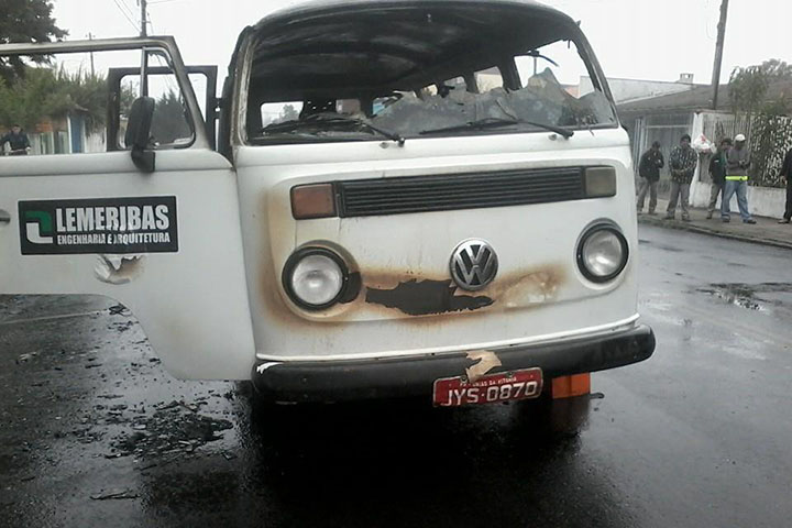 Chegando ao local na rua Santos Dumont em frente a Loja Líder Sul, a equipe se deparou com veículo Kombi, que foi parcialmente consumida pelas chamas.