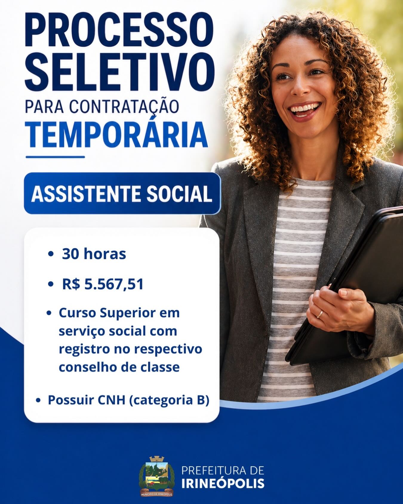 A Prefeitura de Irineópolis está com processo seletivo aberto para contratação temporária de assistente social. A oportunidade prevê carga horária de 30 horas semanais, com remuneração de R$ 5.567,51, conforme divulgado pela administração municipal.