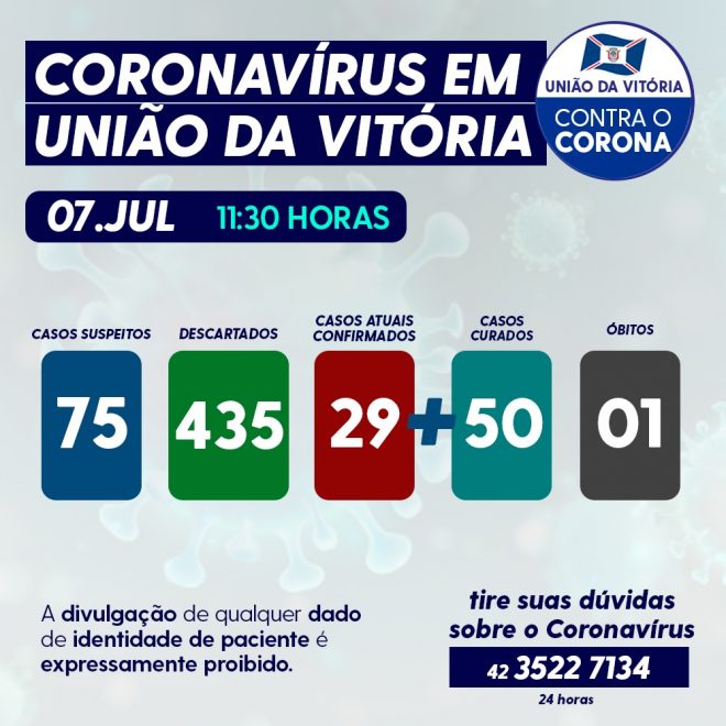 União da Vitória atualizou o boletim epidemiológico desta terça-feira, 07 de julho, e segundo informações divulgadas pela Secretaria Municipal de Saúde, mais 13 novos casos positivos foram confirmados e mais dois pacientes receberam alta hospitalar.