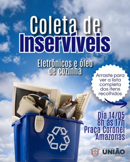 A população está sendo convocada a participar de um importante mutirão de coleta de inservíveis, que acontece no dia 14 de maio, das 8h às 17h, na Praça Coronel Amazonas, em frente à Escola Municipal Professor Serapião. A ação tem como objetivo incentivar o descarte correto de materiais, contribuindo para a preservação do meio ambiente e a manutenção da limpeza urbana.