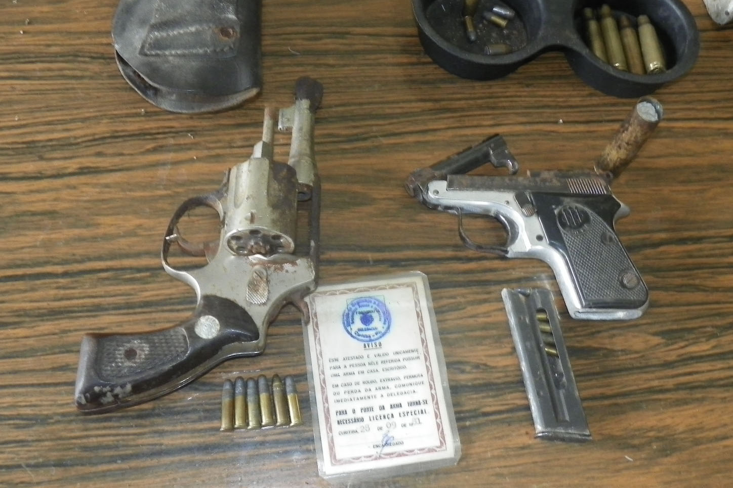 Em seguida os policiais se dirigiram para outra residência e no local a PM encontrou com um cidadão uma espingarda calibre 28 marca Rossi. Em busca na casa foram encontrados mais duas armas, um revólver e uma pistola.