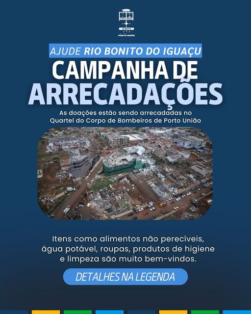 A campanha de arrecadação segue até terça-feira, dia 18, com ponto de entrega na Sede do Corpo de Bombeiros de Porto União. A orientação é para que a comunidade contribua com itens de maior necessidade no momento, como materiais de higiene pessoal, cobertores, alimentos não perecíveis e água potável. De acordo com a Administração Municipal, a mobilização reforça o espírito de união entre as comunidades da região.