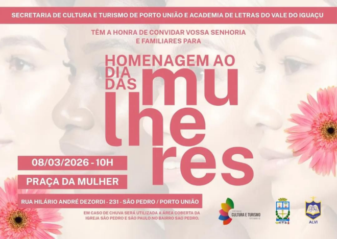 Já no domingo, dia 8 de março, data em que se celebra oficialmente o Dia Internacional da Mulher, a Secretaria Municipal de Cultura e Turismo, em parceria com a Academia de Letras do Vale do Iguaçu (ALVI), promove uma solenidade especial de homenagem às mulheres.