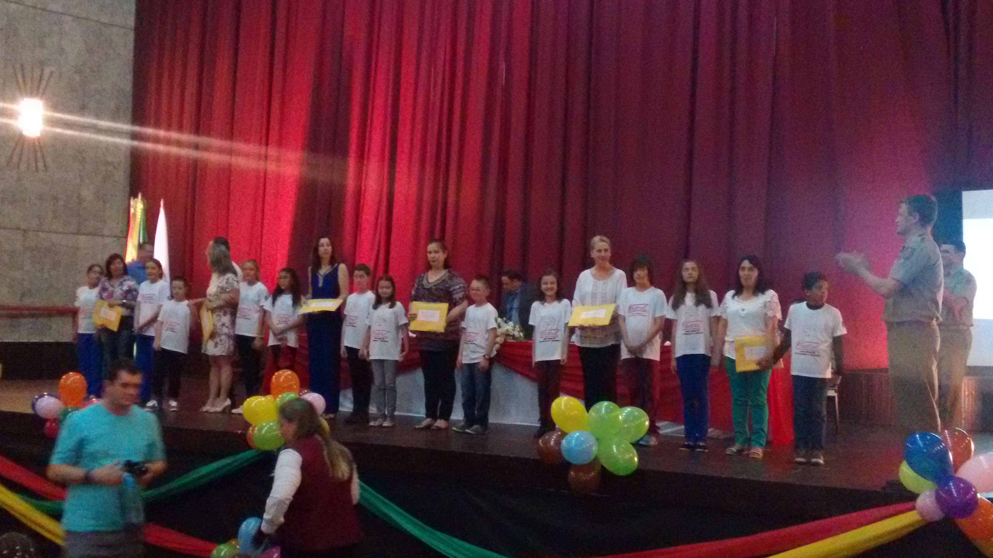 Na sequência dois alunos com a diretora de cada escola subiu ao palco para receber os certificados de todos os alunos. Quem fez a entrega dos certificados foi o comando da PM da cidade e de todos os membros da mesa de autoridades.