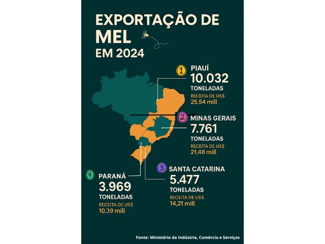 Santa Catarina é o terceiro maior exportado nacional de mel, com com 5.476,8 toneladas exportadas em 202. Além disso, o estado se consolidou como um dos principais produtores de mel do Brasil, ocupando a 8ª posição no ranking nacional em 2023, com uma produção de 4.234 toneladas, o que representa 6,6% da produção total do país.