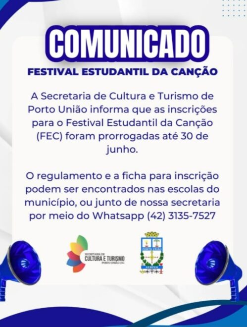 A Secretaria de Cultura e Turismo de Porto União anunciou a prorrogação das inscrições para o Festival Estudantil da Canção. Estudantes interessados em participar do evento agora têm até o dia 30 de junho para garantir sua vaga.