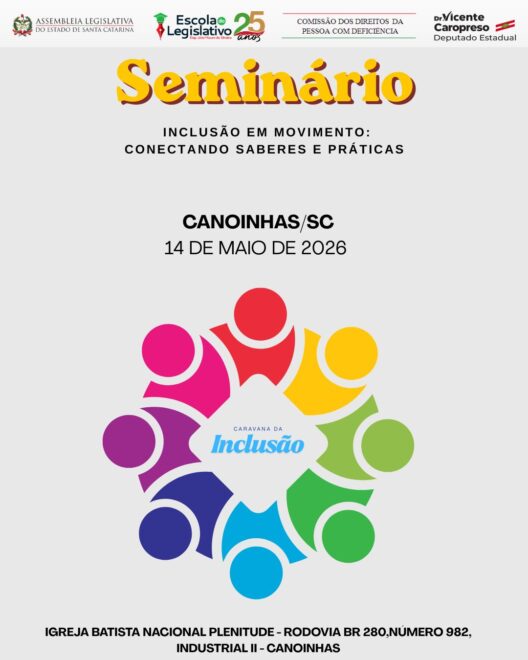 Canoinhas recebe no dia 14 de maio de 2026 o seminário “Inclusão em Movimento: conectando saberes e práticas”, promovido pela Assembleia Legislativa de Santa Catarina, por meio da Escola do Legislativo, em parceria com a Comissão dos Direitos da Pessoa com Deficiência. O evento será realizado na Igreja Batista Nacional Plenitude, reunindo profissionais, educadores e a comunidade em geral para debater práticas inclusivas.