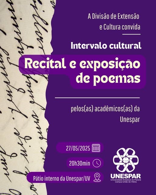 A UNESPAR, campus de União da Vitória estará promovendo neste dia 27 de maio , a partir das 20: 30, um recital e exposição de poemas.