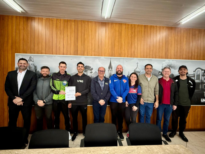 O prefeito de União da Vitória, Ary Carneiro Junior, entregou aos educadores físicos da Secretaria Municipal de Esportes a Lei nº 5.242/2025, que altera o nível inicial de vencimento do cargo de Educador Físico, equiparando o salário desses profissionais aos demais educadores físicos que atuam no município.