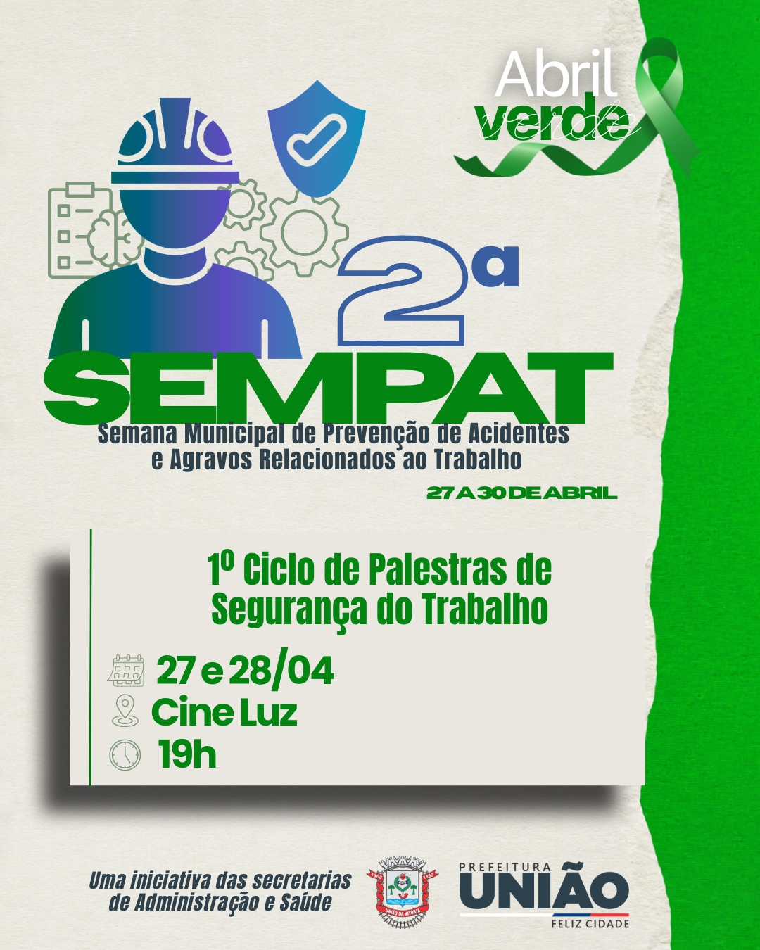 A Prefeitura de União da Vitória realiza, nos dias 27 e 28 de abril de 2026, no Cine Teatro Luz, a 2ª Semana Municipal de Prevenção de Acidentes e Agravos Relacionados ao Trabalho (SEMPAT). O evento integra a programação do Abril Verde e tem como principal objetivo fortalecer a cultura de prevenção por meio da orientação e do diálogo entre trabalhadores, empregadores e profissionais da área de Segurança e Saúde no Trabalho (SST).
