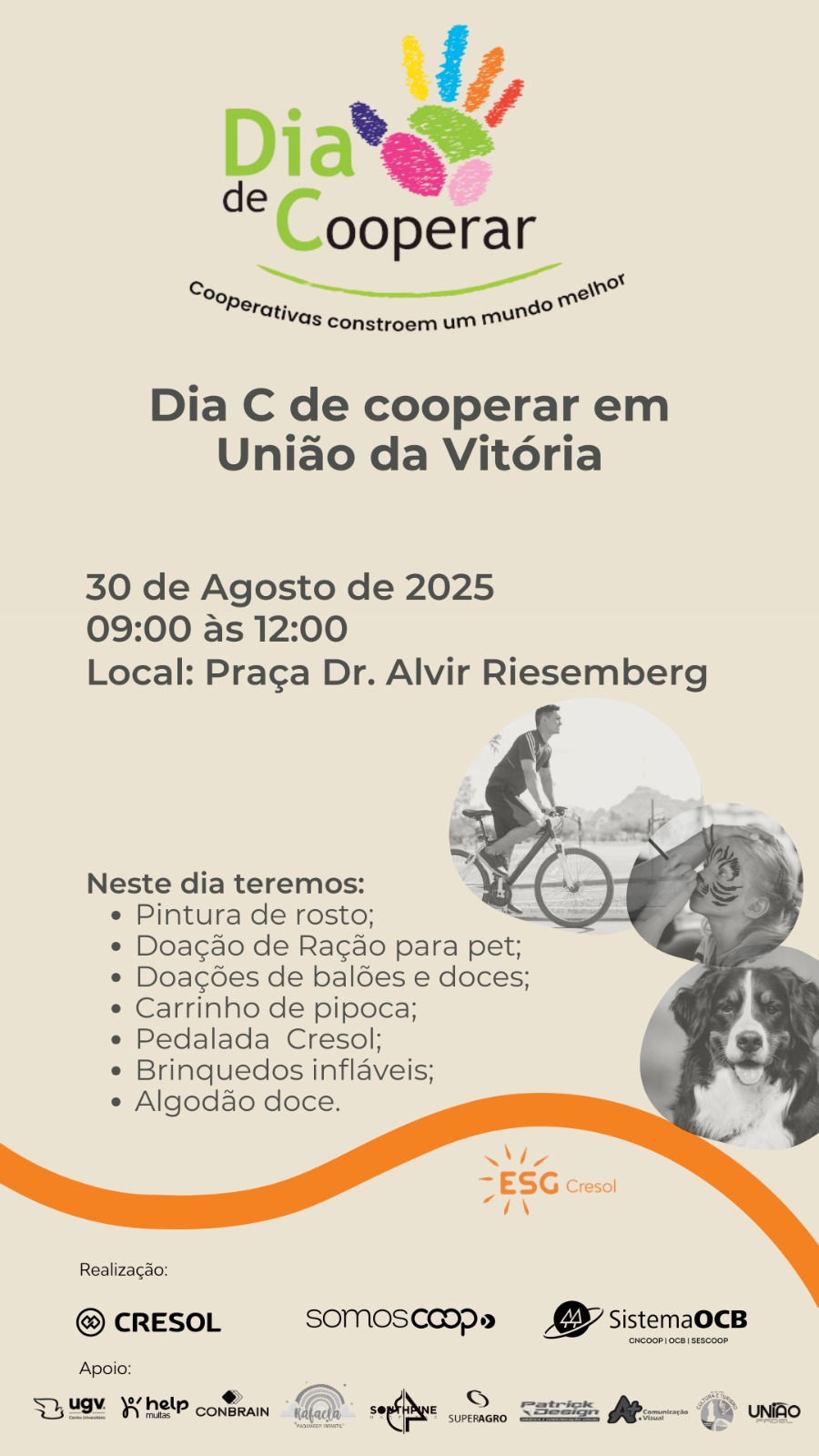 No próximo sábado, dia 30 de agosto, União da Vitória será palco do “Dia C de Cooperar”, iniciativa nacional realizado pela Cresol, em parceria com o Sistema OCB, que busca fortalecer o espírito de cooperação e solidariedade por meio de ações sociais voltadas à comunidade. O evento acontece das 9h às 12h, na Praça Dr. Alvir Riesemberg.