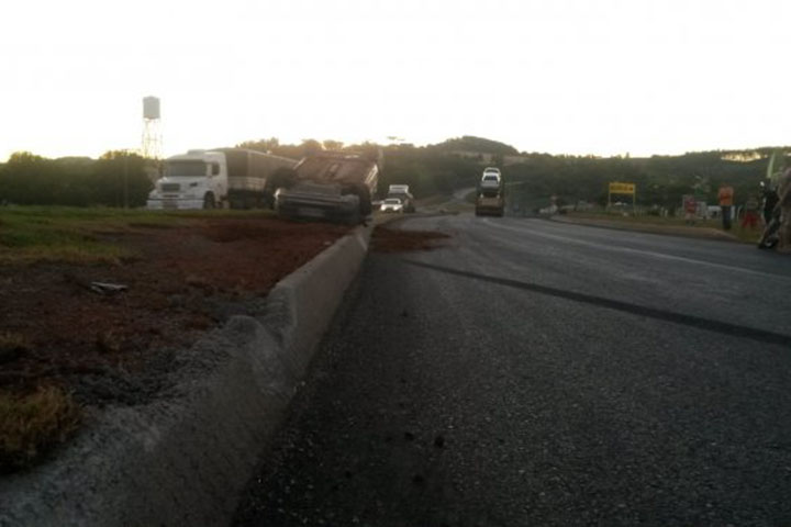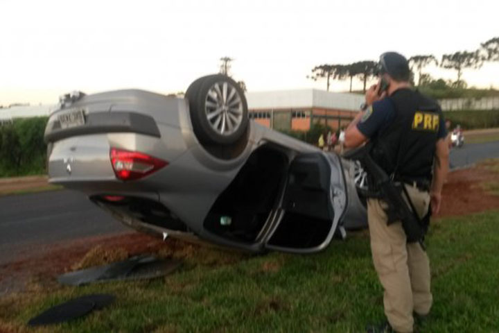 A Polícia Rodoviária Federal de Xanxerê atendeu um capotamento na BR-282, trevo da Femi, no fim da tarde deste domingo, 23. Trata-se de um Megane, placas de União da Vitória (PR) que fazia sentido Xanxerê/Xaxim. Estavam no veículo quatro pessoas e ninguém se machucou. No asfalto havia marcas da frenagem e, após bater na mureta do trevo, o carro ficou com as rodas para cima.