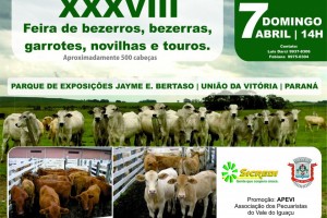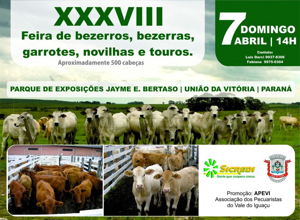 A Associação dos Pecuaristas do Vale do Iguaçu (Apevi), promove a XXXVIII Feira de bezerros, bezerras, garrotes, novilhas e touros, que será realizada neste domingo, 07, a partir das 14h, no Parque de Exposições Jaime Ernesto Bertaso, em União da Vitória. O evento tem o apoio da Prefeitura, por meio da Secretaria Municipal de Agricultura, Pecuária e Abastecimento.